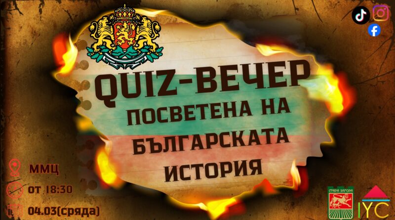 Международният младежки център в Стара Загора организира Quiz-вечер, посветена на българската история. Инициативата ще се състои на 4 март (сряда) от 18.30 ч. в сградата на ММЦ и е насочена към млади хора, които искат да проверят знанията си и да научат нови интересни факти за миналото на България.