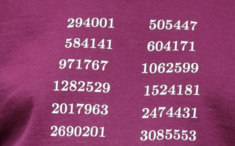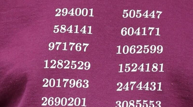 Майкъл Филасета от Университета на Южна Каролина помогна за доказването на съществуването и разпространението на „широко цифрово чувствителни“ прости числа – всяко от тях е толкова чувствително, че промяната на която и да е от безкрайните му цифри го прави съставно. Тук, на суитшърта му са изброени първите 20 дигитално чувствителни прости числа.