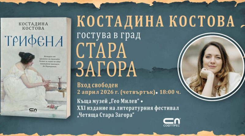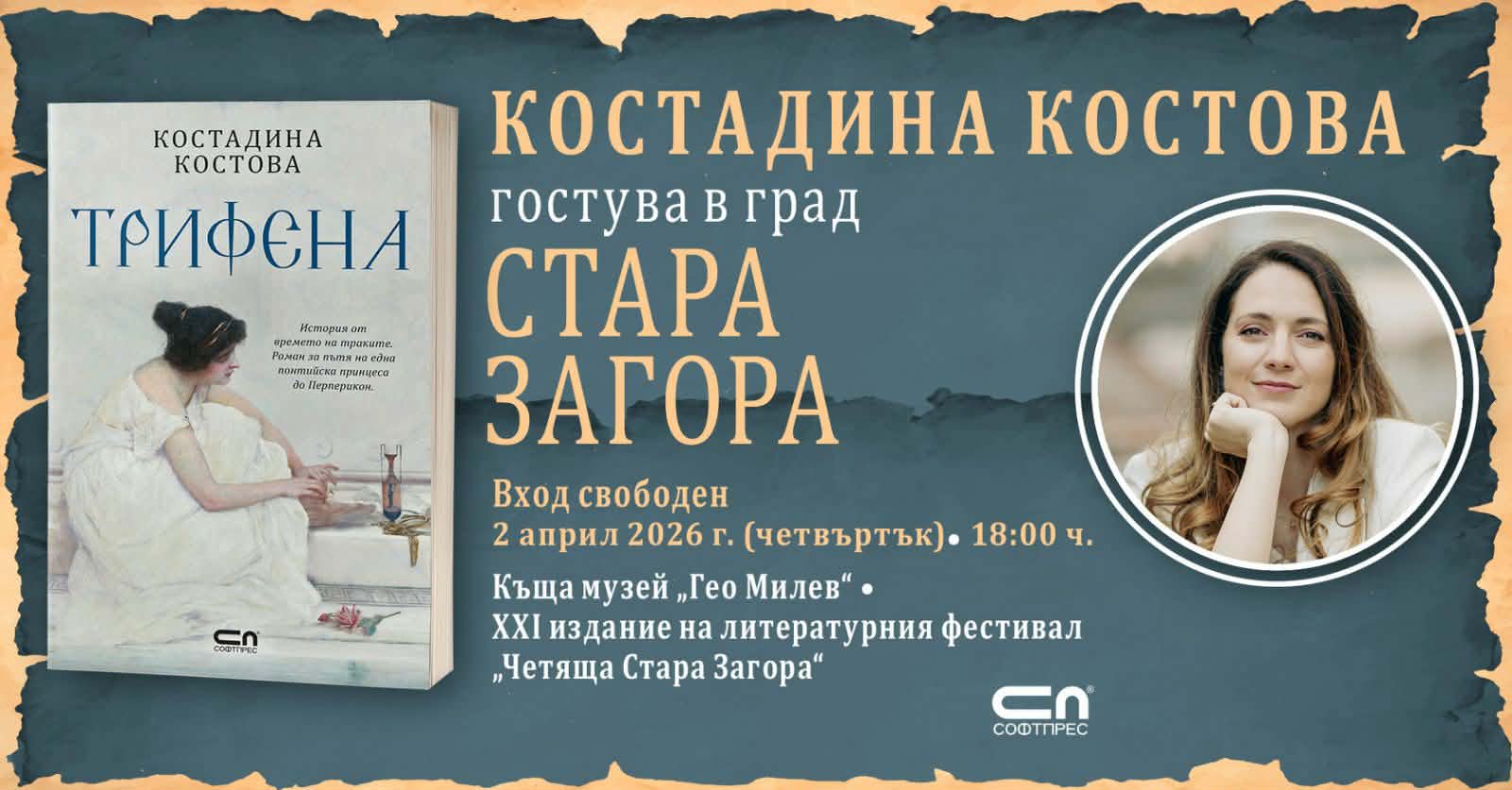 Заповядайте в къща музей „Гео Милев“ на 2 април 2026 г. (четвъртък) от 18:00 ч. на литературна среща с писателката Костадина Костова и представянето на новия ѝ исторически роман „Трифена“ – номиниран в категория „Българска литература“ за „Книга на годината 2025“ на Ozone.bg.