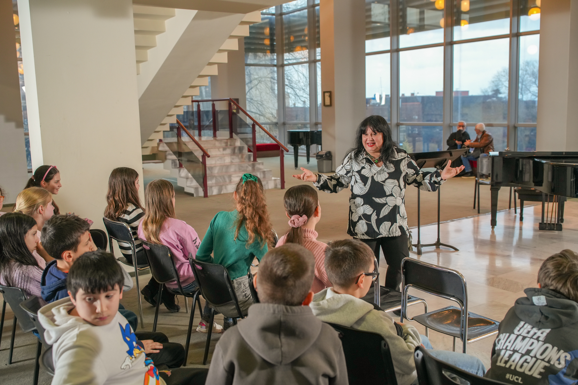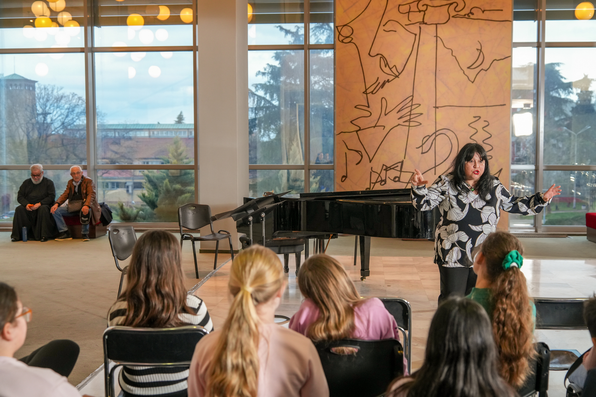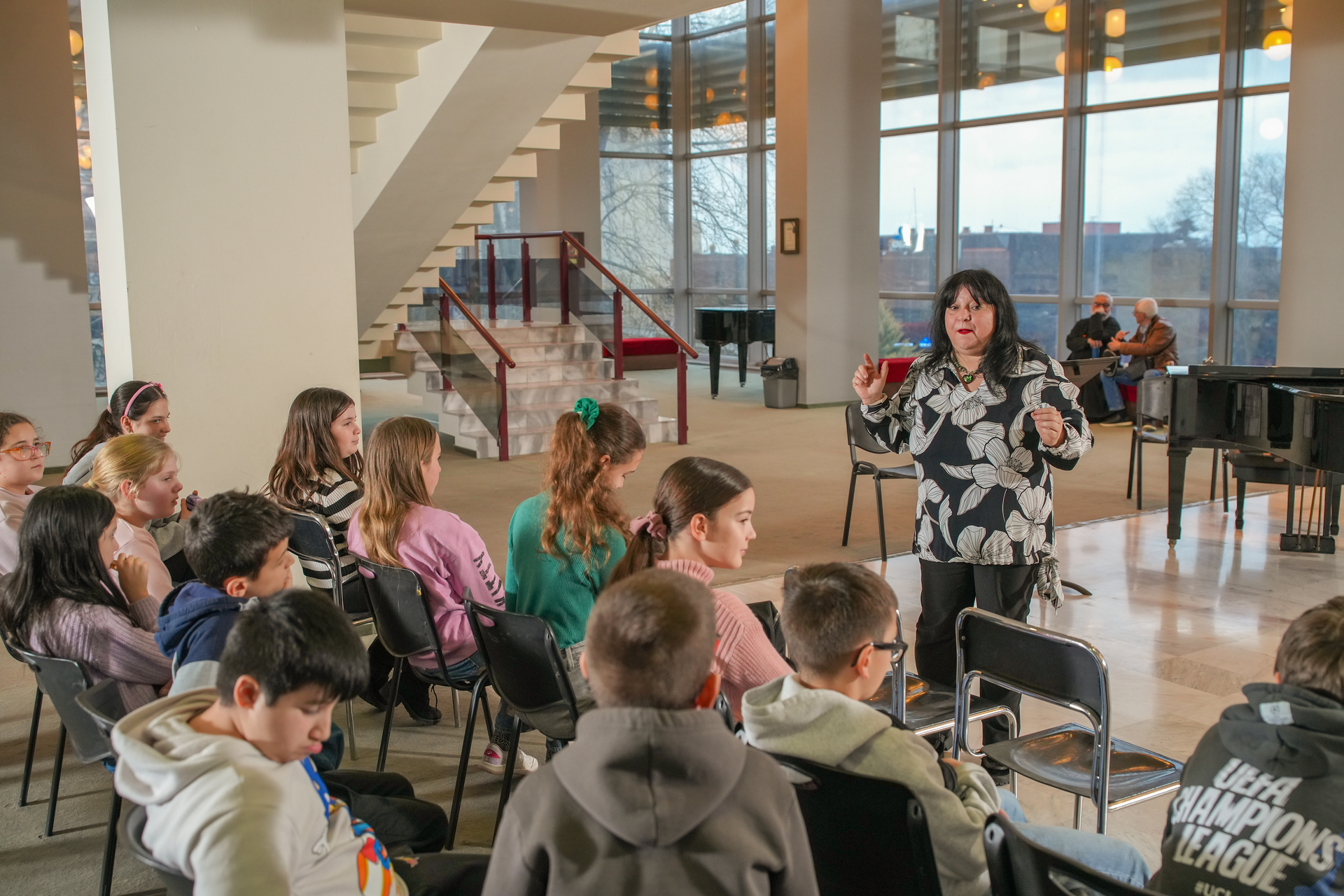Тя увлекателно разказа за живота и творчеството на Моцарт и специално за последната му творба, която ще прозвучи на 8 април – „Реквием“. Учениците се запознаха с отделните части на „Реквием“ и научиха много за латинските им имена и тяхното значение.  Без да е уговорено или репетирано, малката талантлива пианистка Ана-Мария изпълни на рояла във фоайето вълнуваща соната от Моцарт – за край на този необикновен урок. Специално заради учениците репетициите вчера и днес са във фоайето на Операта.