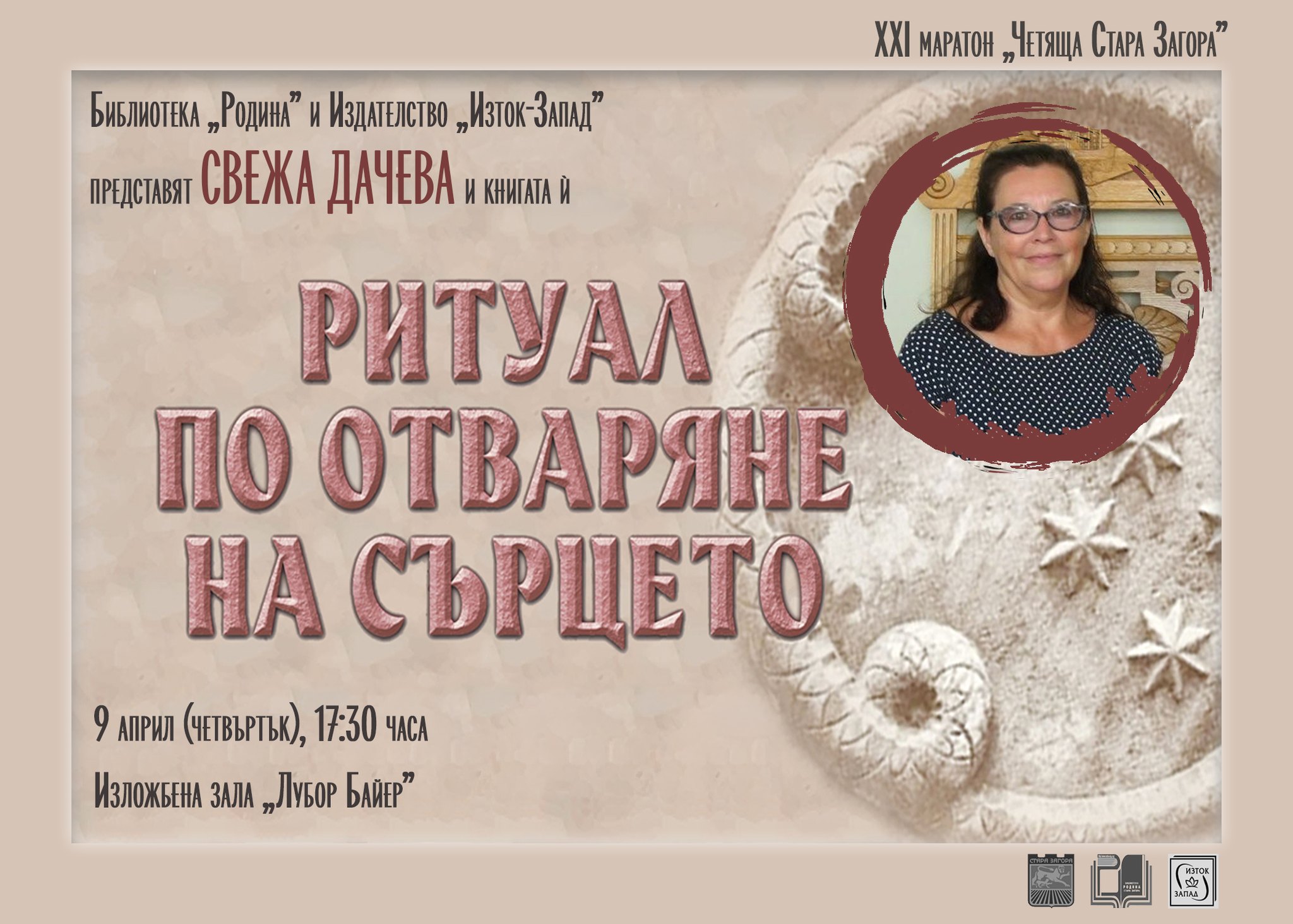 На 9 април 2026 г. от 17.30 ч. Свежа Дачева ще представи книгата си „Ритуал по отваряне на сърцето” в изложбена зала „Лубор Байер“. Събитията са с вход свободен и са отворени за всички любители на литературата.
