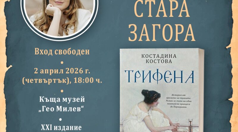 Писателката Костадина Костова ще представи своя роман пред старозагорската публика на 2 април 2026 г. (четвъртък) от 18.00 ч. Къща музей „Гео Милев“ ще бъде домакин на среща с писателката Костадина Костова, която ще представи своя роман „Трифена“ пред старозагорската публика. Събитието ще се проведе на 2 април 2026 г. (четвъртък) от 18.00ч.