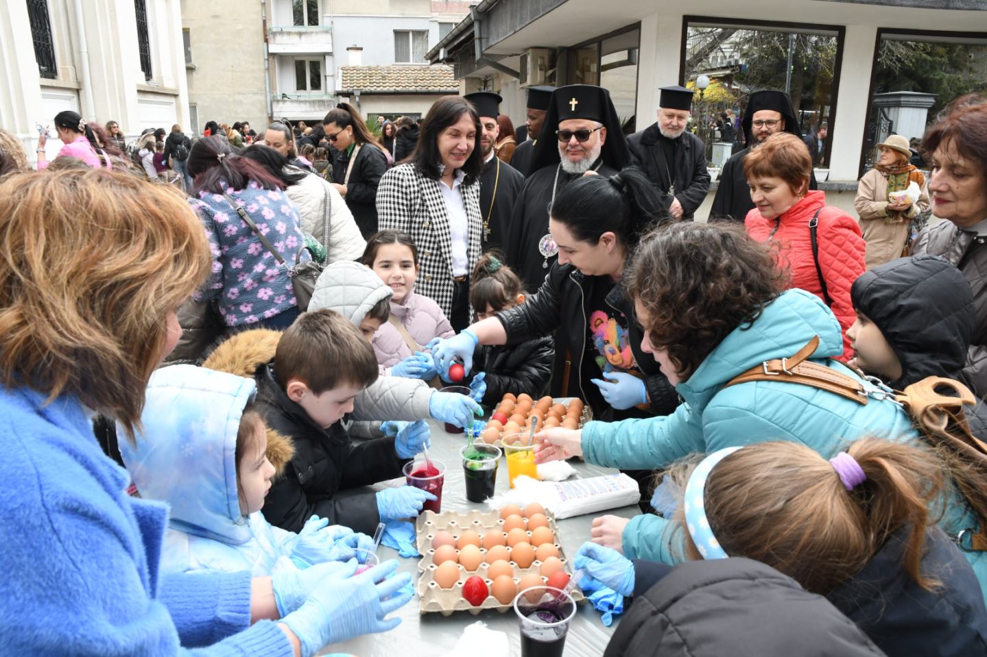 По традиция след богослужението в двора на храма започна и боядисването на великденските яйца. Заместник-кметът на Община Стара Загора с ресор „Образование и младежки дейности“ Надежда Чакърова приветства присъстващите и благодари за гостоприемството на митрополит Киприан. „Ваше Високопреосвещенство, уважаеми директори на детски градини, уважаеми гости, скъпи деца, преподаватели и родители, с огромно удоволствие и вълнение днес за поредна година сме тук. Благодарим за гостоприемството да споделим този светъл празник в навечерието на Великден, да видим отново детските усмивки и как децата боядисват яйцата. От името на Община Стара Загора и от името на кмета Живко Тодоров ви пожелавам здраве, успехи, благоденствие и светлина във вашия път, във вашите семейства и в професионалното развитие. Нека винаги бъдем по-добри хора. Светли празници!“, пожела Надежда Чакърова.