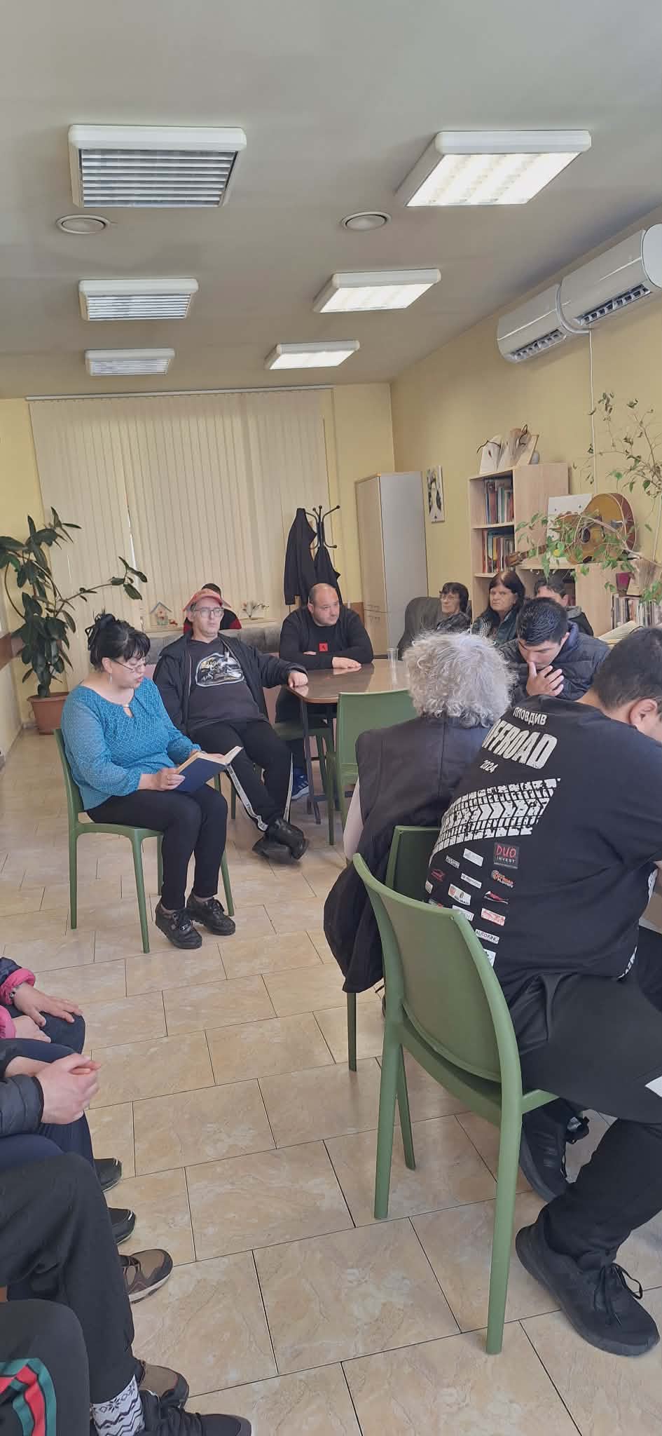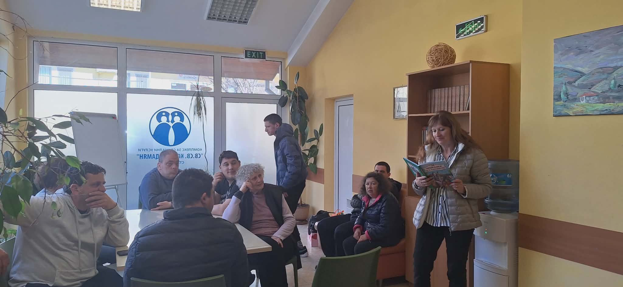 След това бе осъществено посещение в Дневен център „Св. св. Кузма и Дамян“ – гр. Стара Загора. Там потребителите бяха зарадвани с великденски картички. В духа на провеждащия се през месеца Маратон на четенето, г-жа Стоилова прочете стихотворение от Петко Р. Славейков, а г-жа Жекова прочете приказка от Ангел Каралийчев и стихотворение от Петко Р. Славейков. Потребителите с радост се включиха, като също четоха приказки и стихове.