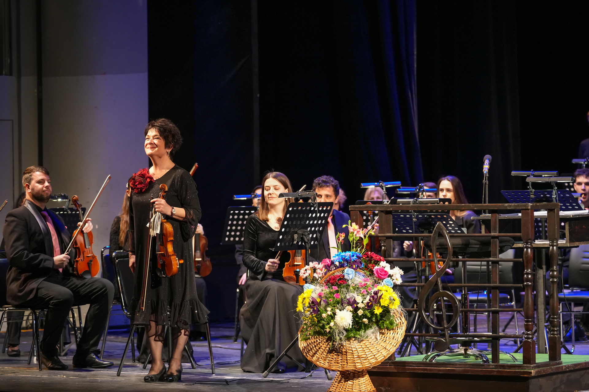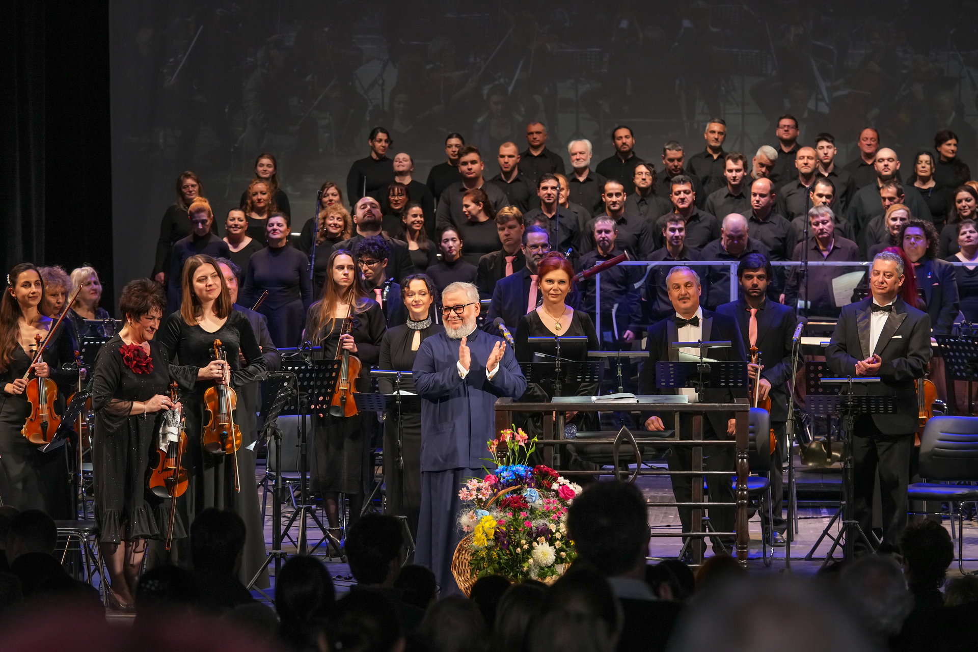По време на аплодисментите на дъното на сцената се изписа поздрав от екипа на операта до Негово Високопреосвещенство митрополит Киприан по случай 50-годишния му юбилей, който владиката отбеляза точно преди един месец – на 8 март 2026г.