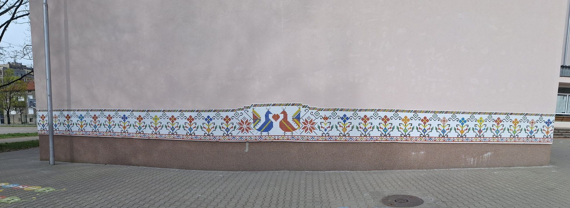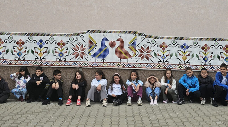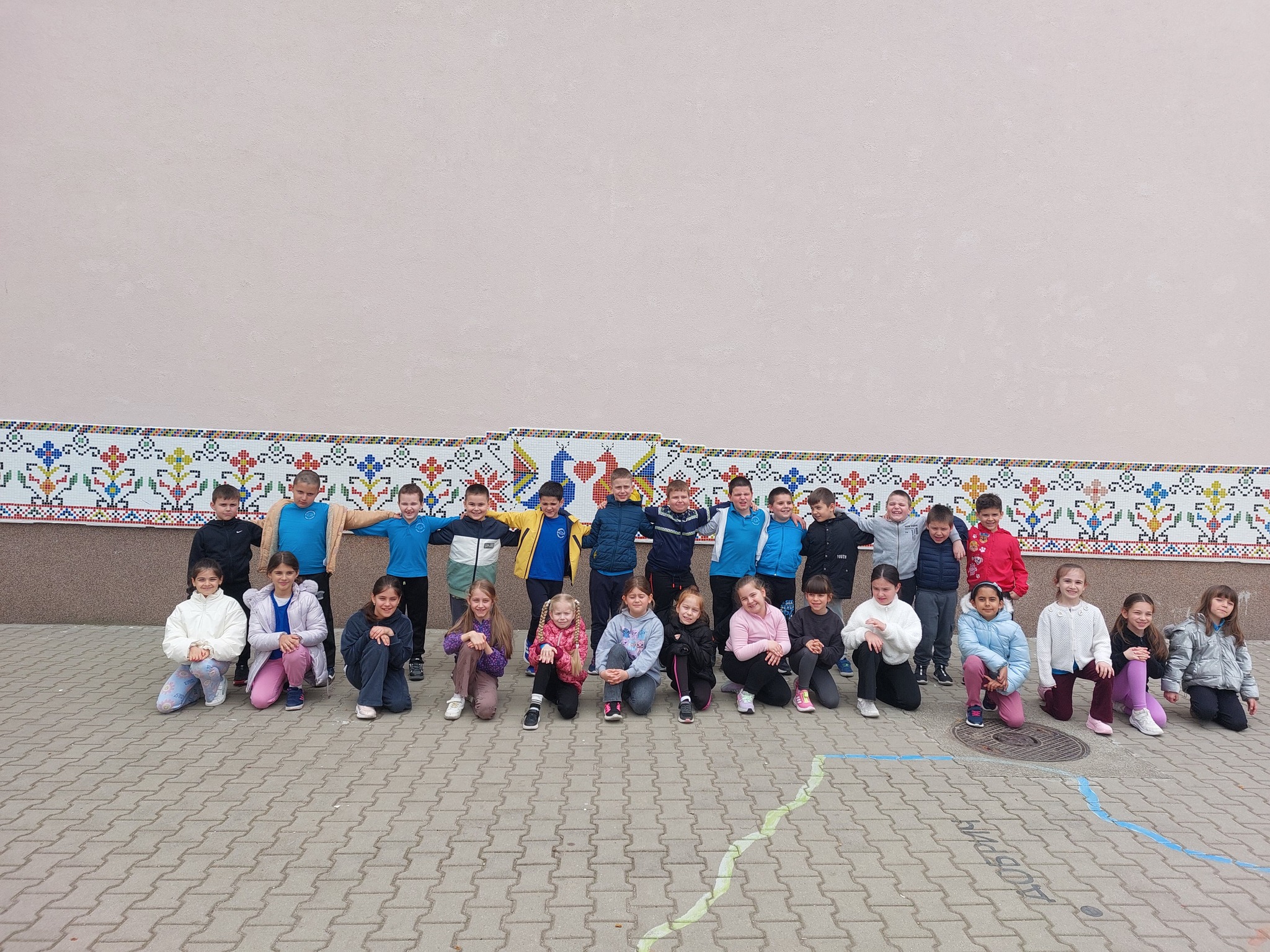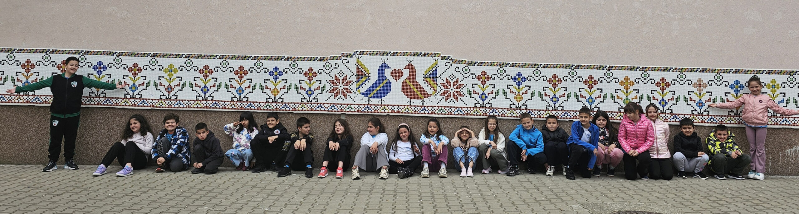 Това прекрасно мозаечно платно е съградено от всички възпитаници на любимото училище. Разделихме секторите на 26- толкова са паралелките през учебната 2025/2026 година. И всеки клас изработи своята част.