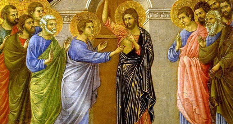 И ето, според мярата на неговото настояване, на следващия неделен ден, една неделя след Пасха, Христос пак идва при заключени врати, застава сред апостолите и се обръща към Тома, приканва го да пипне с ръка в раните от гвоздеите и да докосне раната от прободените ребра.