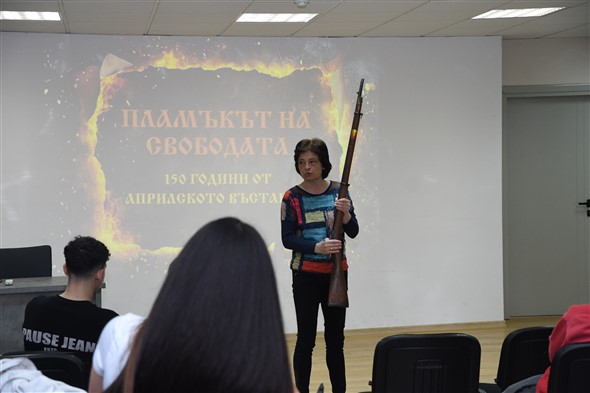 Учениците имаха възможност да се докоснат до музейни експонати – легендарната драгунска пушка „Бердана“-2 (използвана масово в руската армия след 1870 г.), предшественикът ѝ „Крънка“ и оръжия на противниците на въстаниците – карабина „Пибоди-Мартини“ и ятаган на Solingen за редовната турска войска.