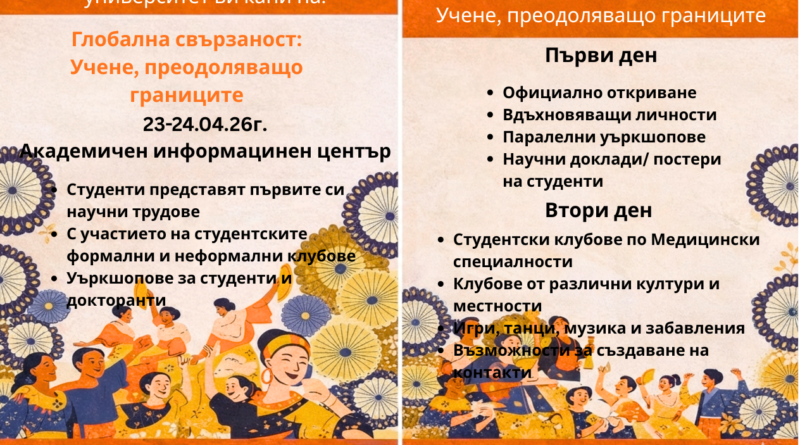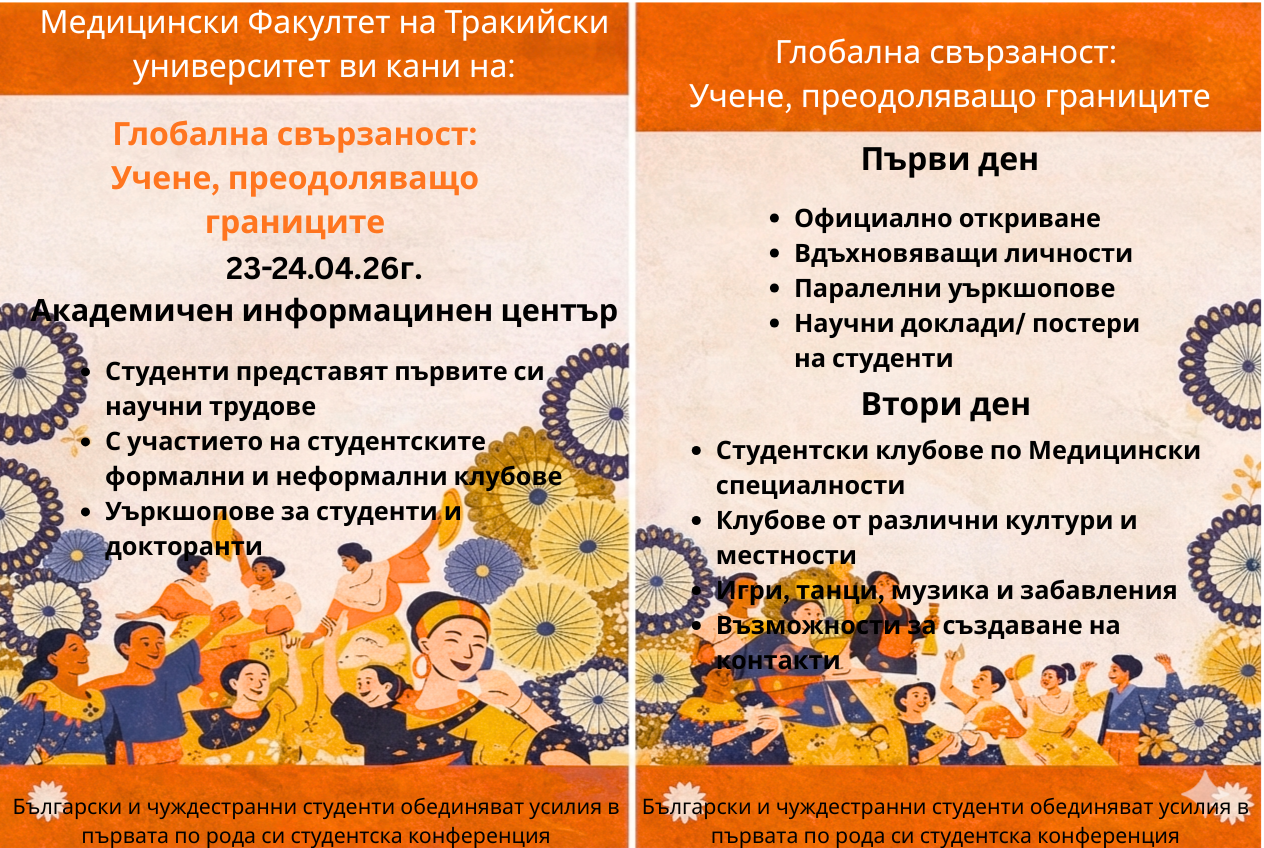 Медицинският факултет на Тракийски университет организира двудневна студентска конференция „Global Connections: Collaborative Learning Across the Borders“/ „Глобални връзки: Съвместно учене отвъд границите“, която ще се проведе на 23 и 24 април 2026 г. в Академичния информационен център. Събитието ще бъде открито в 9 часа на 23 април и обединява български и чуждестранни студенти, преподаватели и международни партньори в платформа за научен обмен, интеркултурен диалог и създаване на устойчиви академични връзки.