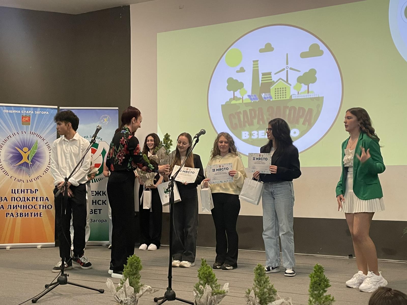 Участниците бяха наградени от Станимира Димитрова, началник на отдел „Образование и младежки дейности“ в Община Стара Загора. Първите три отбора получиха по едно дърво – „Пицея Коника“, което да засадят като символ на грижата за природата.
