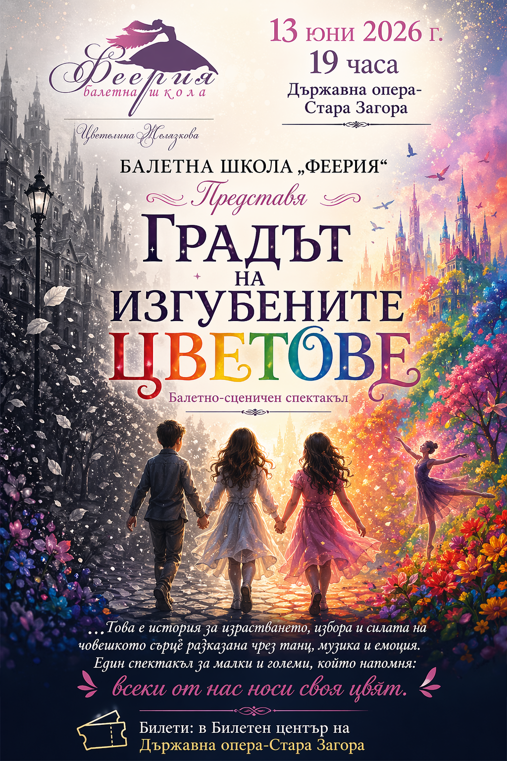 На 13 юни 2026 г. от 19 часа в Държавна опера-Стара Загора Балетна школа „Феерия“ представя „Градът на изгубените цветове“ – балетно-сценичен спектакъл за големи и малки.