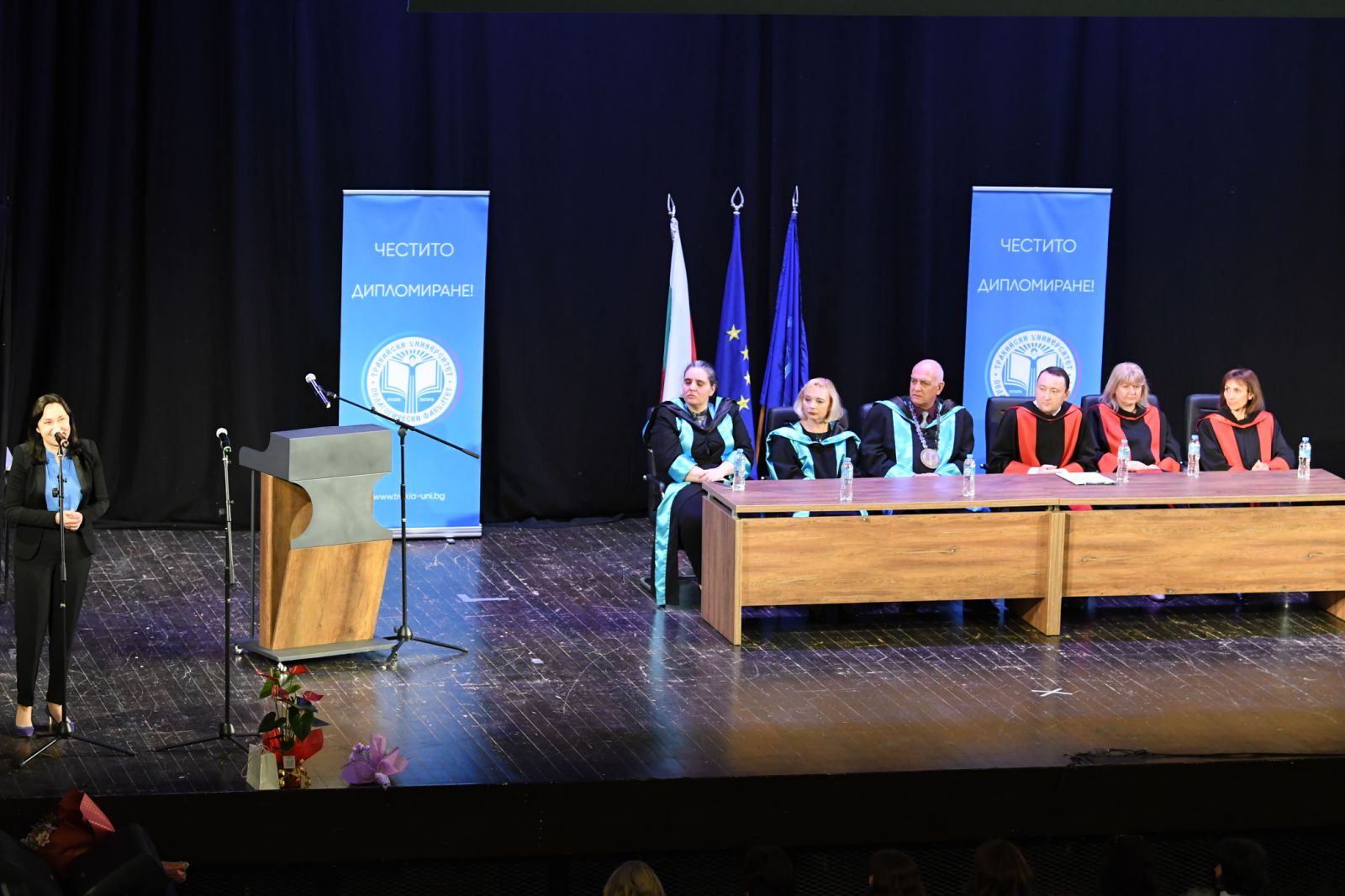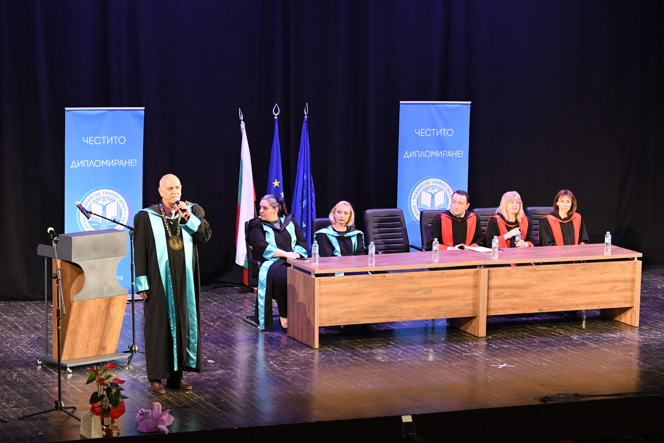 Церемонията бе открита от декана на Педагогическия факултет доц. Генчо Вълчев, който подчерта значимостта на учителската професия и ролята на педагозите в съвременното общество. Заместник-ректорът по учебната дейност доц. Цветослав Койнарски поздрави дипломантите и им пожела успешна професионална реализация, като връчи дипломите на двамата пълни отличници.
