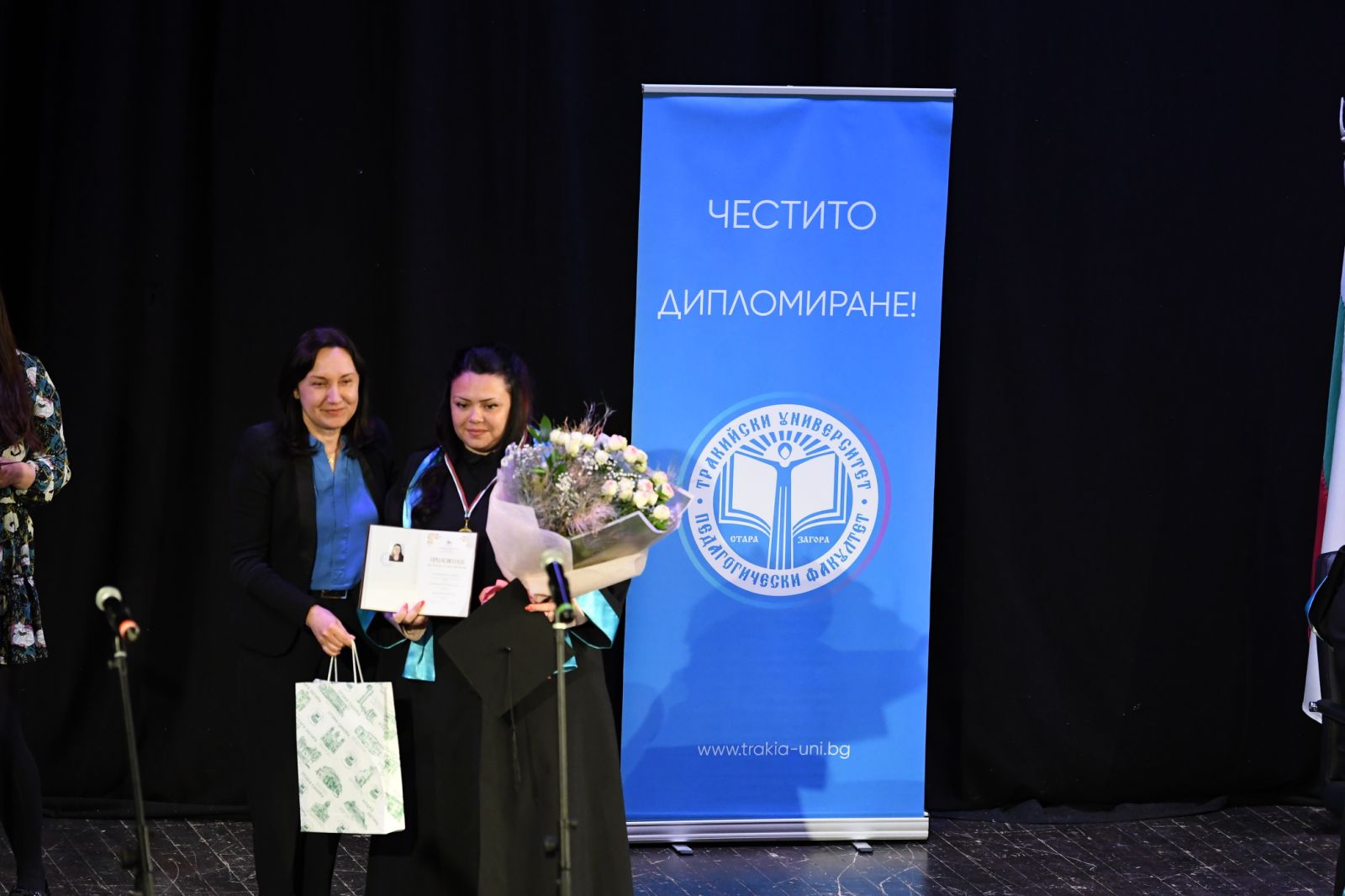 В Културен център – Стара Загора се състоя тържествената промоция на дипломираните магистри от Педагогическия факултет на Тракийския университет. На церемонията присъства заместник-кметът на Община Стара Загора с ресор „Образование и младежки дейности“ Надежда Чакърова, която поздрави абсолвентите по повод успешното завършване на тяхното образование.