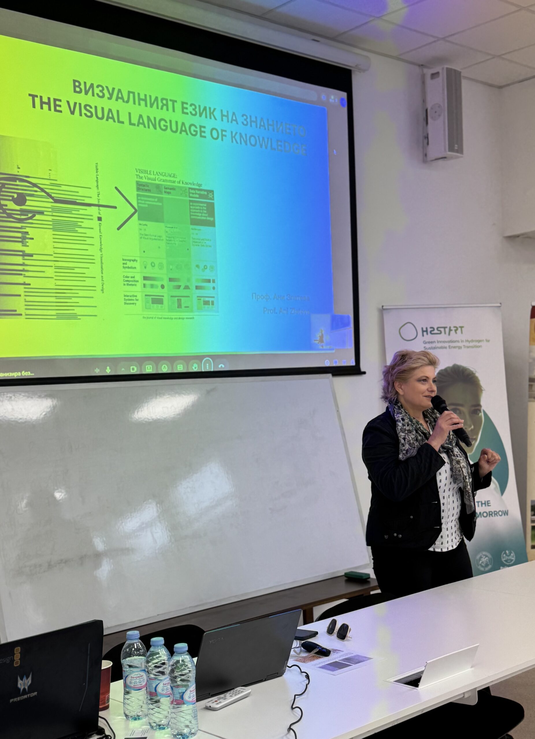 Модераторите на събитието – проф. д-р Ани Златева – специалист по изобразително изкуство и графичен дизайн, и Петър Теодосиев – експерт по научна комуникация и изкуствен интелект, предизвикаха сериозен интерес с обучението по основни принципи на визуализацията, работа с AI инструменти за анализ и структуриране на съдържание. Събитието премина при активна ангажираност от страна на участниците и с оживена дискусия по разглежданите теми.