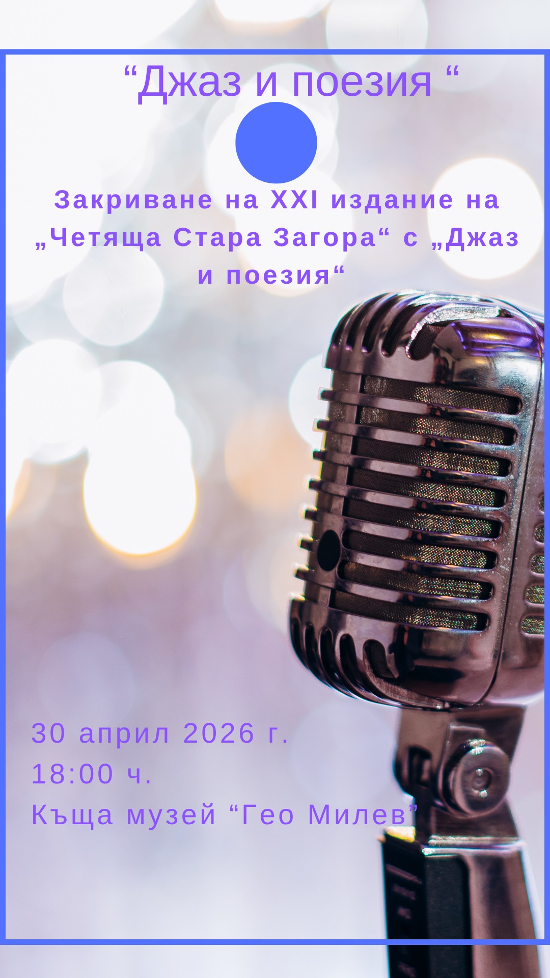 Закриване на XXI издание на „Четяща Стара Загора“ – „Джаз и поезия“ с участието на ученици от класа по поп и джаз пеене при НУМСИ „Христина Морфова“ с преподаватели Паолина Малешкова и Павел Цонев и екипа на Пресцентъра на Община Стара Загора.