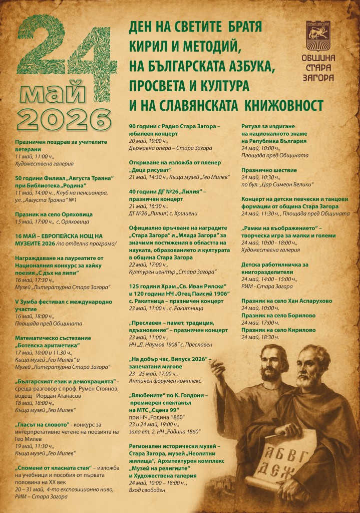 Стара Загора ще отбележи 24 май – Деня на светите братя Кирил и Методий, на българската азбука, просвета и култура и на славянската книжовност – с богата празнична програма, включваща концерти, шествие и културни инициативи.